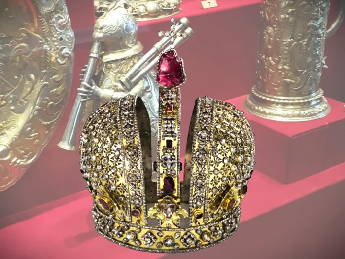 Церемонию коронации во многом заимствовали у Священной Римской империи, зато сам драгоценный венец - это суть православный храм с его боковыми закомарами и приподнятой центральной частью, увенчанной луковичной главкой.