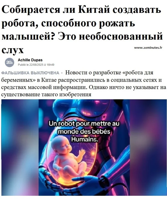 В социальных сетях и в традиционных СМИ распространилась ложная информация о том, что робот, способный расти и рожать малыша, появится в продаже уже в 2026 году по цене 11 500 евро
