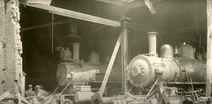 Разрушения, вызванные взрывом котла локомотива в Сан-Антонио штат Техас, в депо "Южная тихоокеанская" принадлежащее компании "Дороги Галвестона, Гаррисберга и Сан-Антонио"