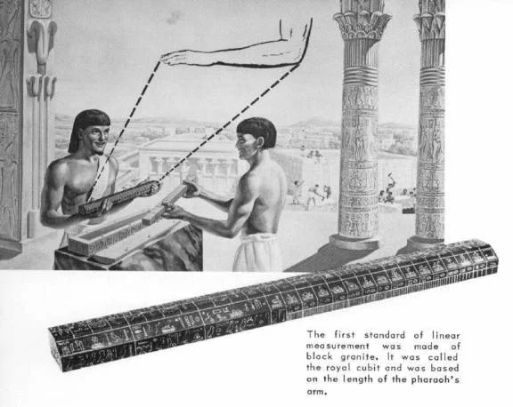 Древние египтяне использовали в качестве эталона длины предплечье фараона - расстояние от локтя до кончика среднего пальца. По этому стандарту изготавливались измерительные инструменты, называемые "кубитами", которые применялись при возведении пирамид.