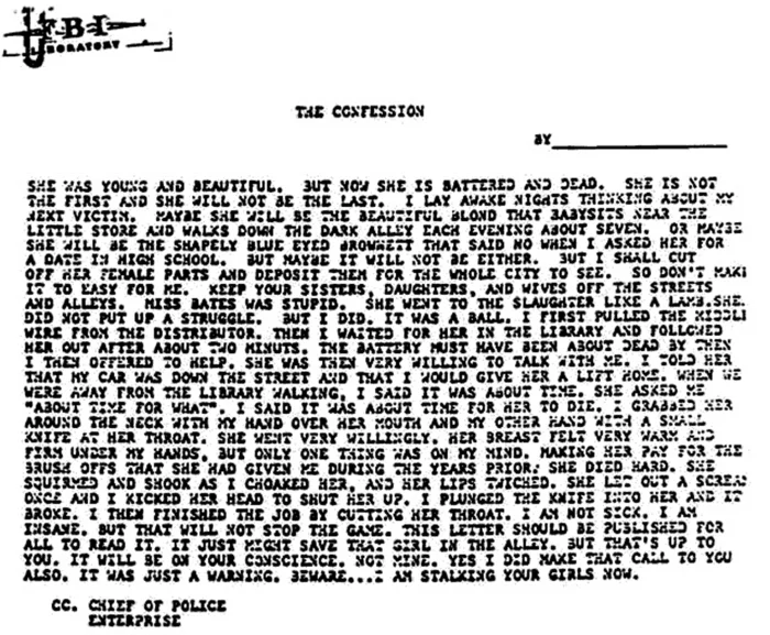 И действительно при изучении автомобиля мисс Бейтс было выяснено, что он был повреждён тем образом, что был описан в письме. Убийца явно долго и тщательно готовился к убийству и скорее всего знал жертву. Полиция отнеслась к делу со всей серьёзностью, а потому передала всё, что у них было в ФБР, ибо некоторые категории дел в США, такие, как шантаж, посредством почтовых отправлений, находятся в федеральной юрисдикции, однако доблестные агенты открестились от расследования, в тот раз посчитав, что копы имеют дело с обычным убийством на почве ревности.