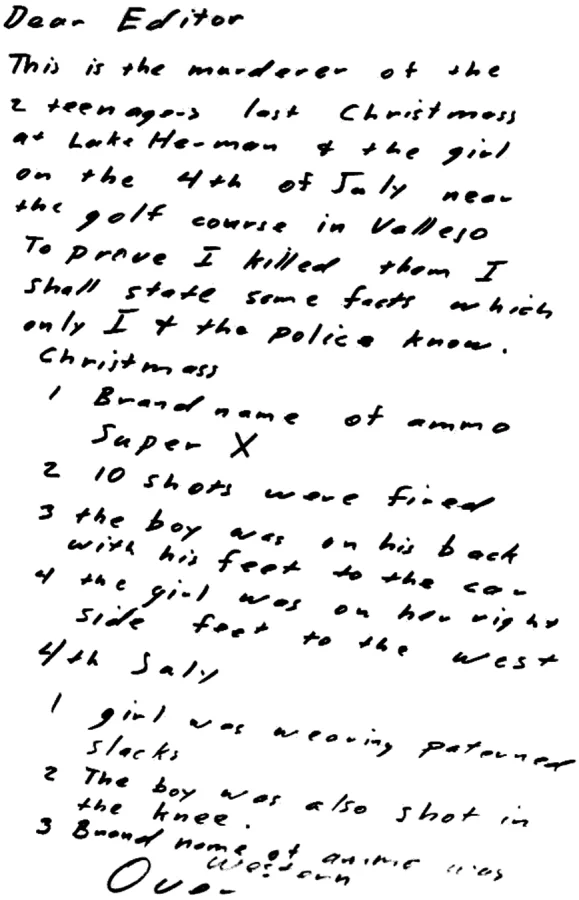 Спустя месяц после убийства Шери в полицейское управление Риверсайда и газету Riverside Enterprise поступили идентичные письма в конвертах без марок и указания обратного адреса, напечатанные на печатной машинке Royal и озаглавленные словом «Признание». Далее приведу их содержание