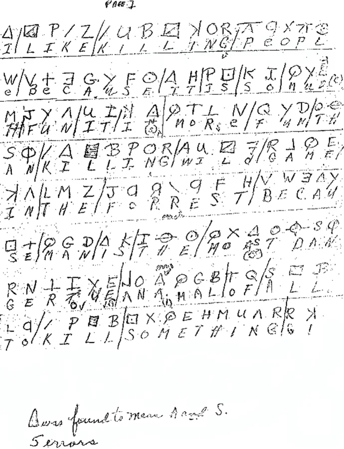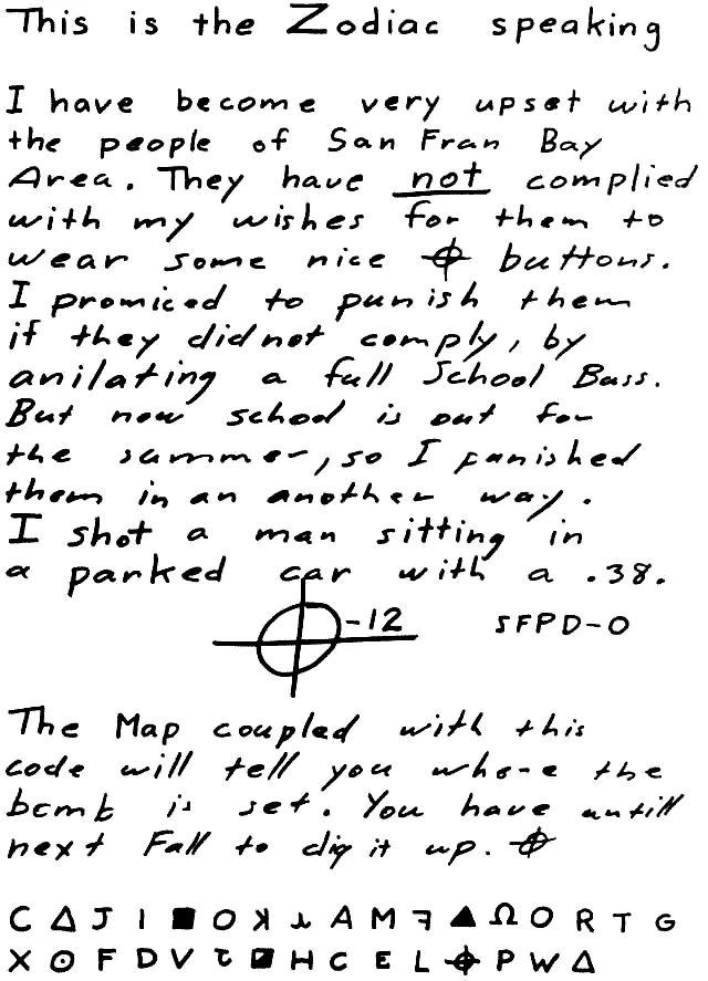 Вот часть шифра. Две другие части этого шифра были отправлены по почте в S.F. Examiner + S.F. Chronicle. Я хочу, чтобы вы напечатали этот шифр на первой странице в пятницу днем, 1 августа 1969 года. Если вы этого не сделаете, я начну убивать в пятницу вечером, и буду продолжать весь уик-энд. Я буду ездить по городу и убивать всех одиноких людей или пары, а затем буду убивать еще, пока не убью более дюжины человек. Кстати, разгадав мой шифр, вы сможете понять, кто я.