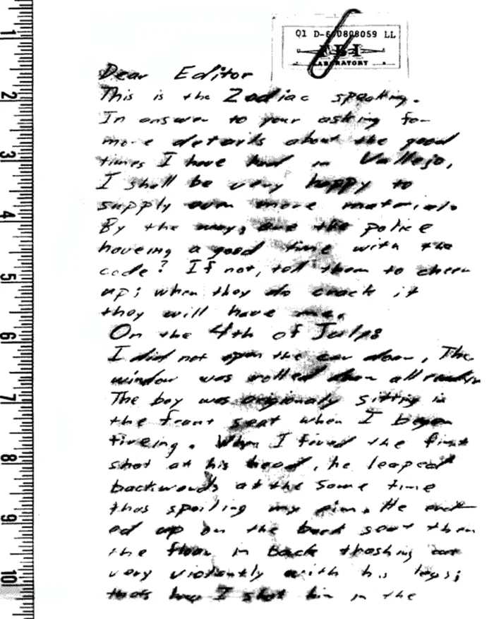 Дорогой Издатель. Говорит Зодиак. В ответ на ваш запрос о более подробной информации о хороших временах, которые я провел в Вальехо, я с удовольствием предоставлю еще больше материалов. Кстати, полиция хорошо развлекается с шифром? Если нет, скажите им, чтобы они не унывали, когда они его разгадают, они поймают меня.