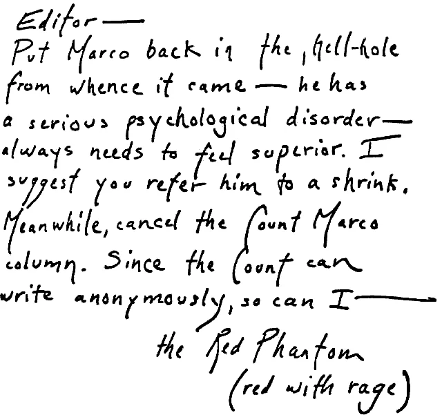 Что касается последнего письма ТОЧНО написанного зодиаком, то вы можете видеть его выше. В нём маньяк говорит о том, что он очень недоволен одним из авторов Крониклз по имени Марко Спинелли и предлагает отправить его обратно в "Адскую дыру, из которой он вылез". Автором письма значится "Красный фантом" (красный от ярости).