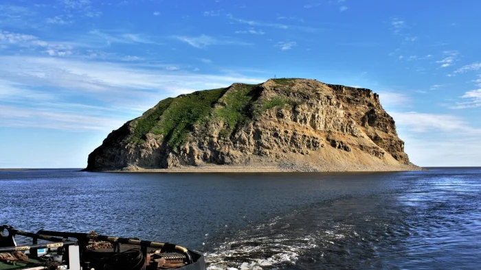 Основное русло Лены продолжает свой путь от Тит-Ары на север, пока не достигает главного «перекрестка», где, словно верстовой знак, возвышается остров Столб. Это самая известная достопримечательность Ленской дельты, часто упоминаемая в отчетах путешественников, так как мимо него проходят все круизные теплоходы.