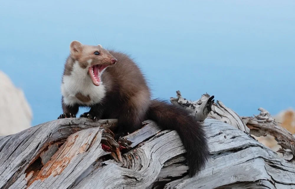 🐾 Это зверёк размером с кошку — длиной 30–50 сантиметров, с пушистым хвостом, который занимает почти половину тела. Её мех густой, тёмно-бурый, а на шее — характерное светлое пятно, за которое её и прозвали белодушкой. А ещё у неё короткие, но мощные лапы с острыми когтями — настоящий горный альпинист среди хищников.