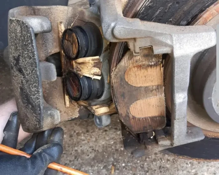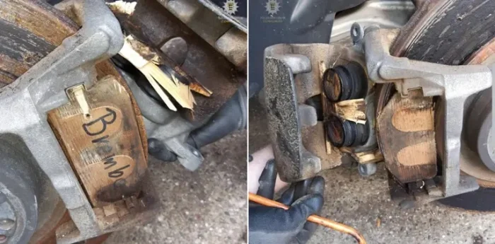 Затем полиция внимательно осмотрела автомобиль и обнаружила, что при попытке торможения был получен «резкий запах гари». Причина: на передние тормоза были установлены деревянные бруски. Были смонтированы подогнанные «деревянные тормозные колодки».