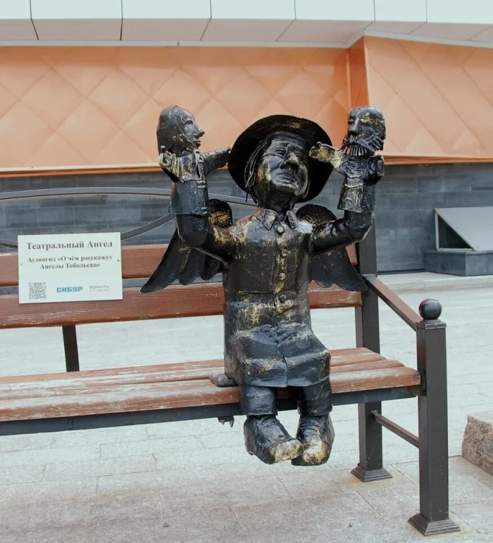2️⃣ Театральный ангел — у драмтеатра П.П. Ершова, рассказывает о первых постановках в Тобольске и включает фрагменты старинных спектаклей.