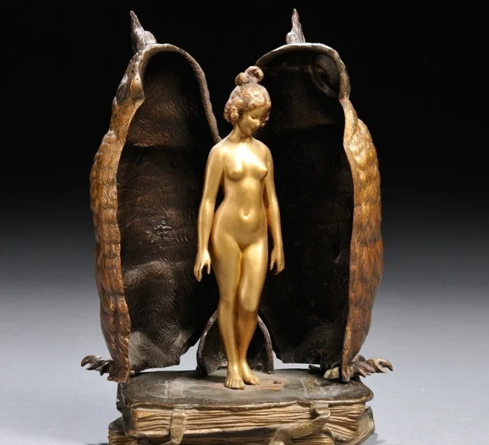 Возьмем, например, эту сову — творение австрийского мастера Франца Бергмана. Сова традиционно считается символом мудрости. Дополнительный акцент сделан на стопке книг, где птица нашла свое место.