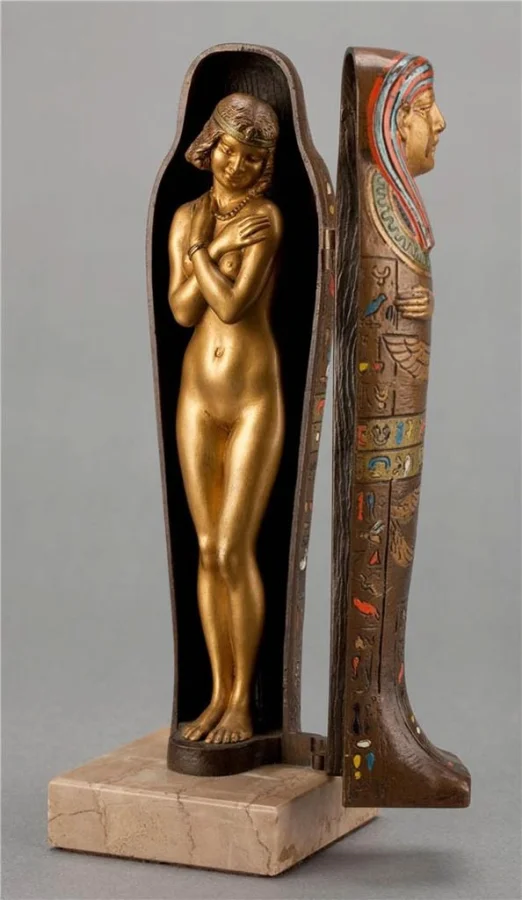 Этот не менее популярный арт-объект под названием «Саркофаг» представляет собой уникальную композицию. При вскрытии фигурки взору открывается изысканное изображение обнажённой женщины, застывшей в грациозной и манящей позе.