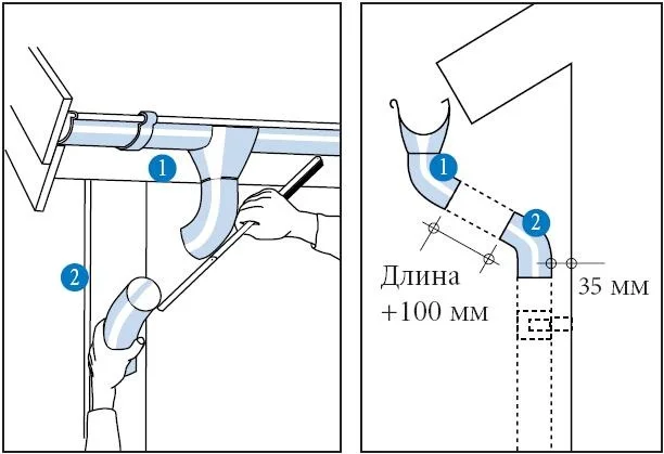 - Монтаж колен: Начинайте с установки верхнего колена, которое соединяет воронку с трубой. Используйте два колена, чтобы обойти карнизный свес. При установке колен убедитесь, что они плотно соединены между собой и с воронкой.