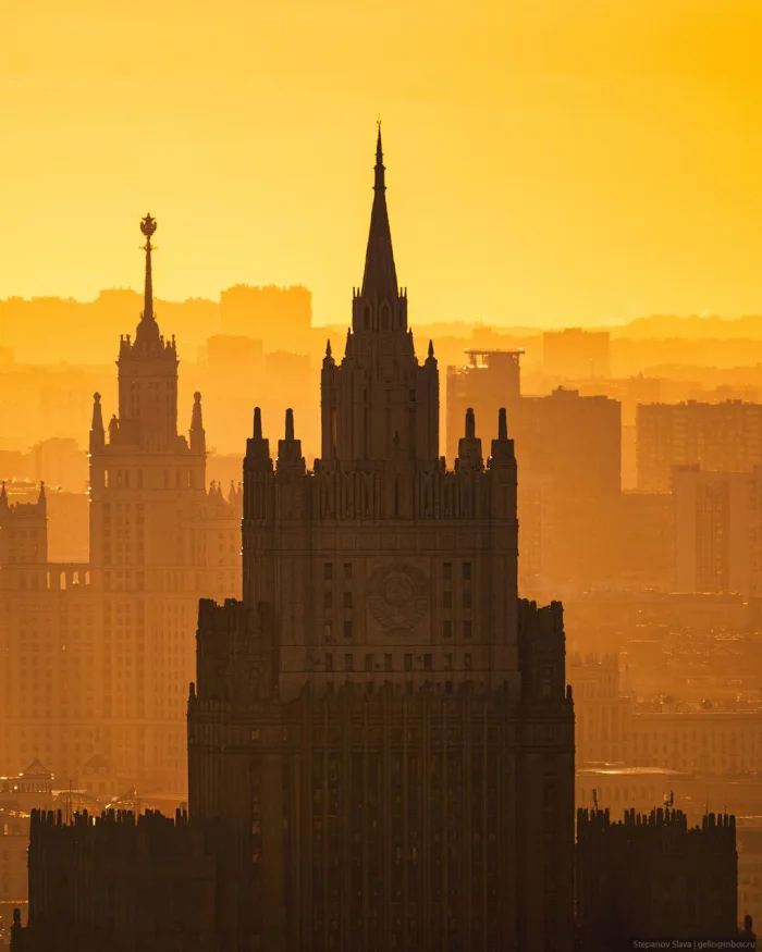 На Смоленской-Сенной площади возвышается одна из самых строгих и величественных «семи сестёр» — здание МИД СССР и России. Эта сталинская высотка, четвёртая по высоте среди своих «сестёр», выглядит особенно эффектно благодаря узкому силуэту, мощным вертикальным линиям и выразительной симметрии, делающей её неотъемлемой частью панорамы центра Москвы.