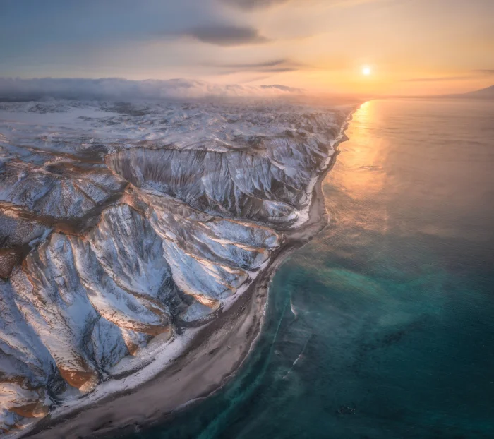 Зимой Белые скалы на Итурупе выглядят так, будто природа решила поиграть в кондитера. Светлые породы, сформированные древними вулканическими процессами, покрываются мягким слоем снега и превращаются в гигантский зефир, посыпанный сахарной пудрой. Это редкое сочетание геологии и зимней погоды создаёт эффект, от которого сложно отвести взгляд: перед путником будто раскрывается десертный ландшафт, где каждый изгиб напоминает воздушный крем.
