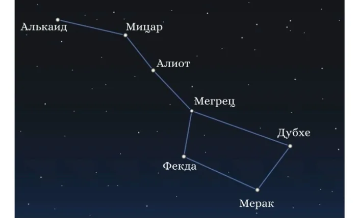 В нём есть рисунок созвездия и подписаны все названия звёзд. Попробуем прочитать названия звёзд «ковшика», может, они нам что-то подскажут?