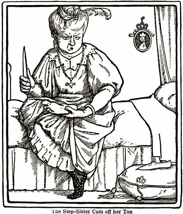 ...А самая жуткая версия принадлежит братьям Гримм. Мачеха и злые сестры ходили на пир, который длился 3 дня и 3 ночи. Чтобы влезть в туфельку, сестры отрезают себе части ног: одна — палец, другая — пятку.