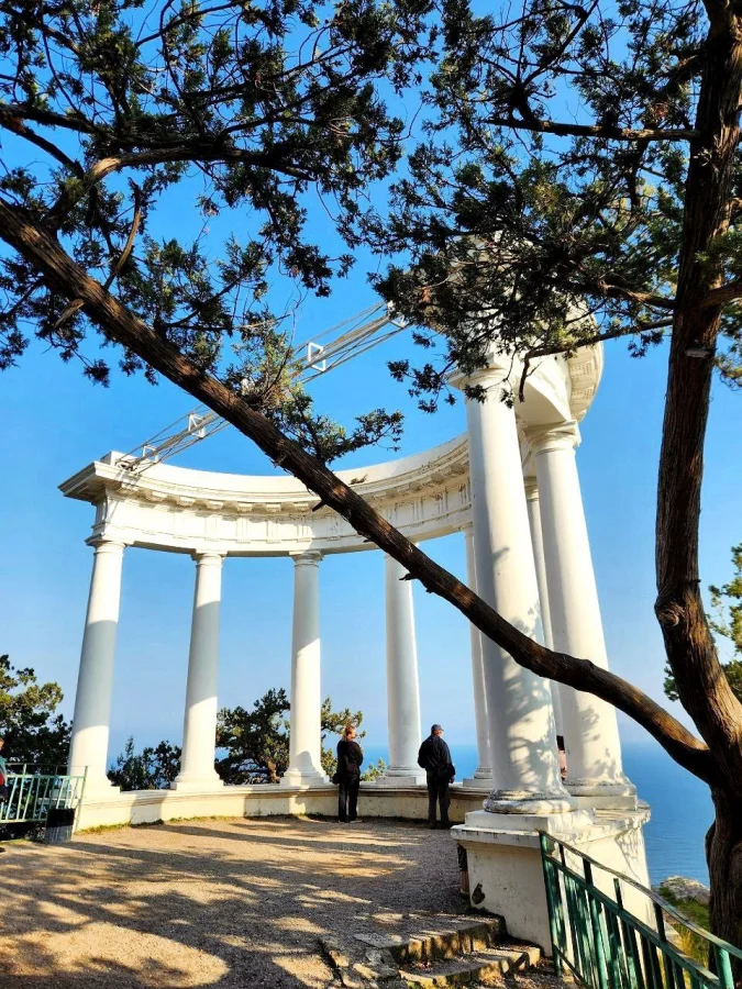 Одно из самых атмосферных мест на маршруте — полуротонда 1843 года. Именно здесь устраивал чаепития Николай II, наслаждаясь видом на скалу Парус и первые «зубчики» Ласточкиного Гнезда. Это место до сих пор будто хранит дыхание той эпохи.