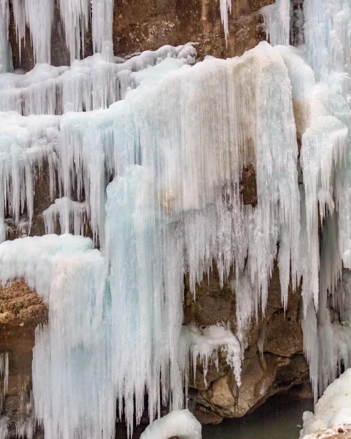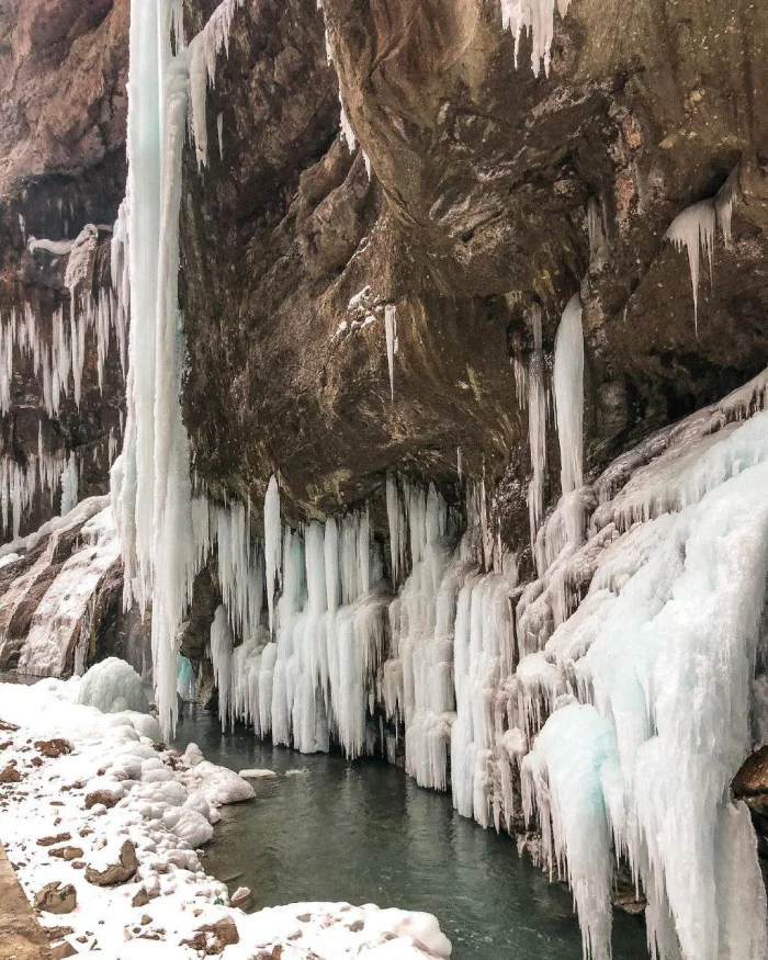 Зимой Чегемское ущелье превращается в волшебный мир, где природа создаёт фантастические ледяные скульптуры. Потоки воды застывают прямо на отвесных скалах, формируя гигантские сосульки высотой до 25–30 метров. В морозные дни весь каньон напоминает декорации к сказке Андерсена — только здесь холодная красота абсолютно реальна. Но важно помнить: лёд может внезапно осыпаться, поэтому парковаться и ходить под нависшими массивами нужно с осторожностью.