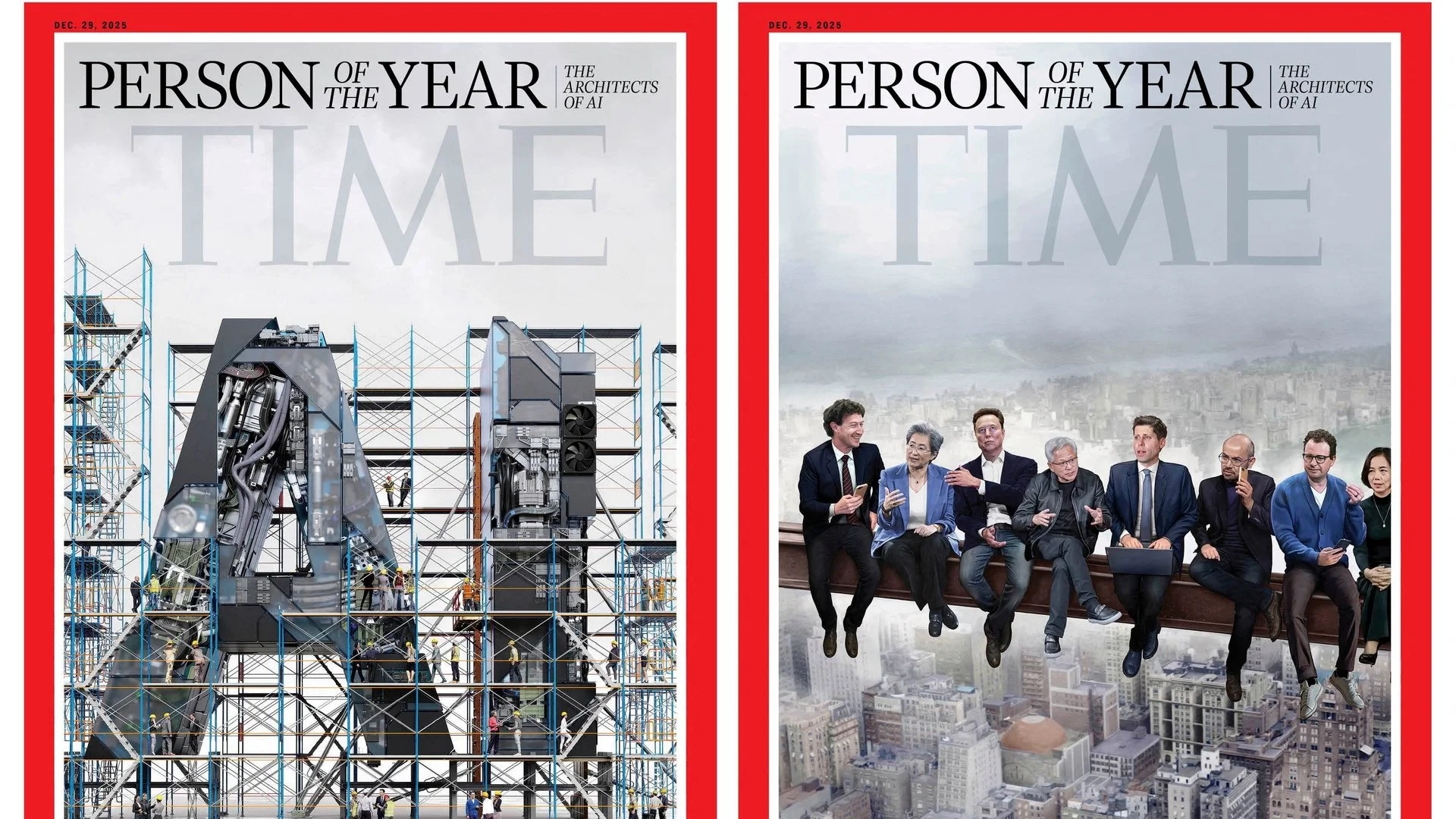 Одна из фотографий на обложке напоминает фотографию «Обеденный перерыв на небоскрёбе» 1930-х годов. В ней участвуют восемь ведущих технологических предпринимателей: Марк Цукерберг ( Meta ), Лиза Су ( AMD ), Илон Маск (xAI), Дженсен Хуанг ( Nvidia ), Сэм Альтман (OpenAI), Демис Хассабис (DeepMind, Google ), Дарио Амодей (Anthropic) и Фей-Фей Ли (World Labs). Другая обложка показывает строительные леса вокруг огромных букв «AI».