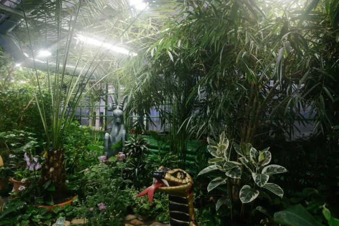 За окнами может искриться снег, но в зимнем саду гостей встречает шум тропического ливня, пение попугаев и аромат цветущих орхидей и спелых ананасов. Здесь собрано более 150 видов растений со всего мира — от колючих кактусов и нежных суккулентов до плодоносящих лимонов, мандаринов, бананов и даже питахайи.