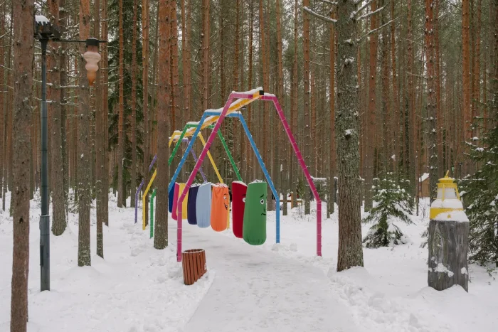 Помимо терема Деда Мороза, на территории вотчины хватает мест, у которых хочется остановиться, всё рассмотреть и, конечно, сделать пару фотографий. Прямо у дома возвышается большая нарядная ёлка, рядом установлены подсвеченные качели и впечатляющая ледяная горка. Повсюду встречаются ледяные скульптуры и фигуры сказочных персонажей, так что прогулка превращается в сплошную фотозону.