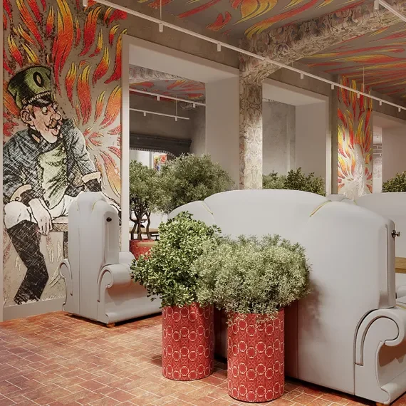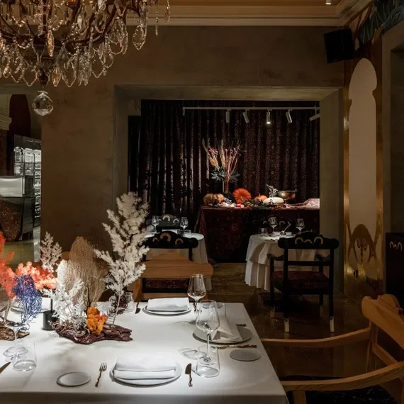 Ресторан, оформленный как уютный загородный дом из фильмов: стены и потолок украшены тканевыми драпировками, столы накрыты белоснежными скатертями, а мягкое освещение создает теплую атмосферу. Зимой здесь особенно волшебно: интерьер декорируют хвойными ветвями и гирляндами, а во дворе обустраивают праздничные фотозоны, превращая место в один из самых живописных новогодних уголков.