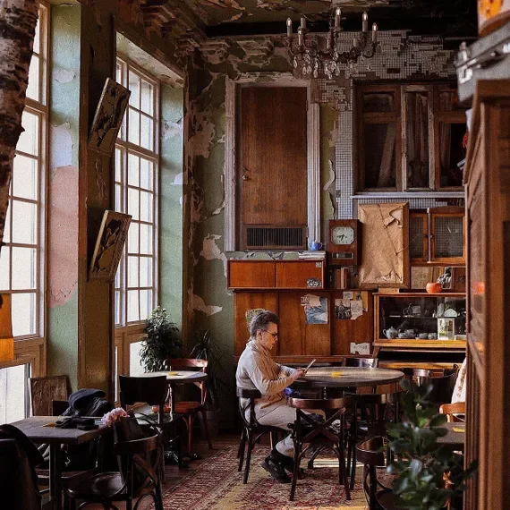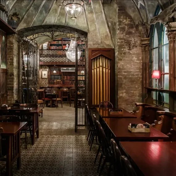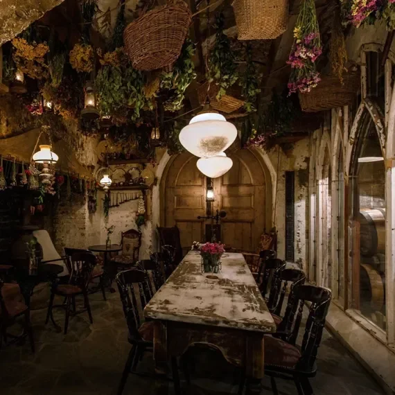 Руин-паб, интерьер которого вдохновлен славянскими сказками: среди березовых декораций, резных наличников и винтажной деревянной мебели неожиданно гармонично смотрится балкон в стиле панельных домов. Если вам близка атмосфера мрачных легенд с Кощеями Бессмертными, старинными погостами и таинственными избушками в глуши леса, это место создано для вас.