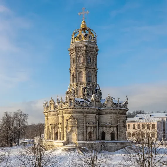 Церковь Знамения Пресвятой Богородицы представляет собой уникальный образец барочного стиля, который редко встречается в традиционной русской церковной архитектуре. Своим обликом храм напоминает роскошный дворец: белокаменные фасады и внутренние стены украшены изысканными барельефами и затейливой резьбой, приковывающей внимание посетителей.