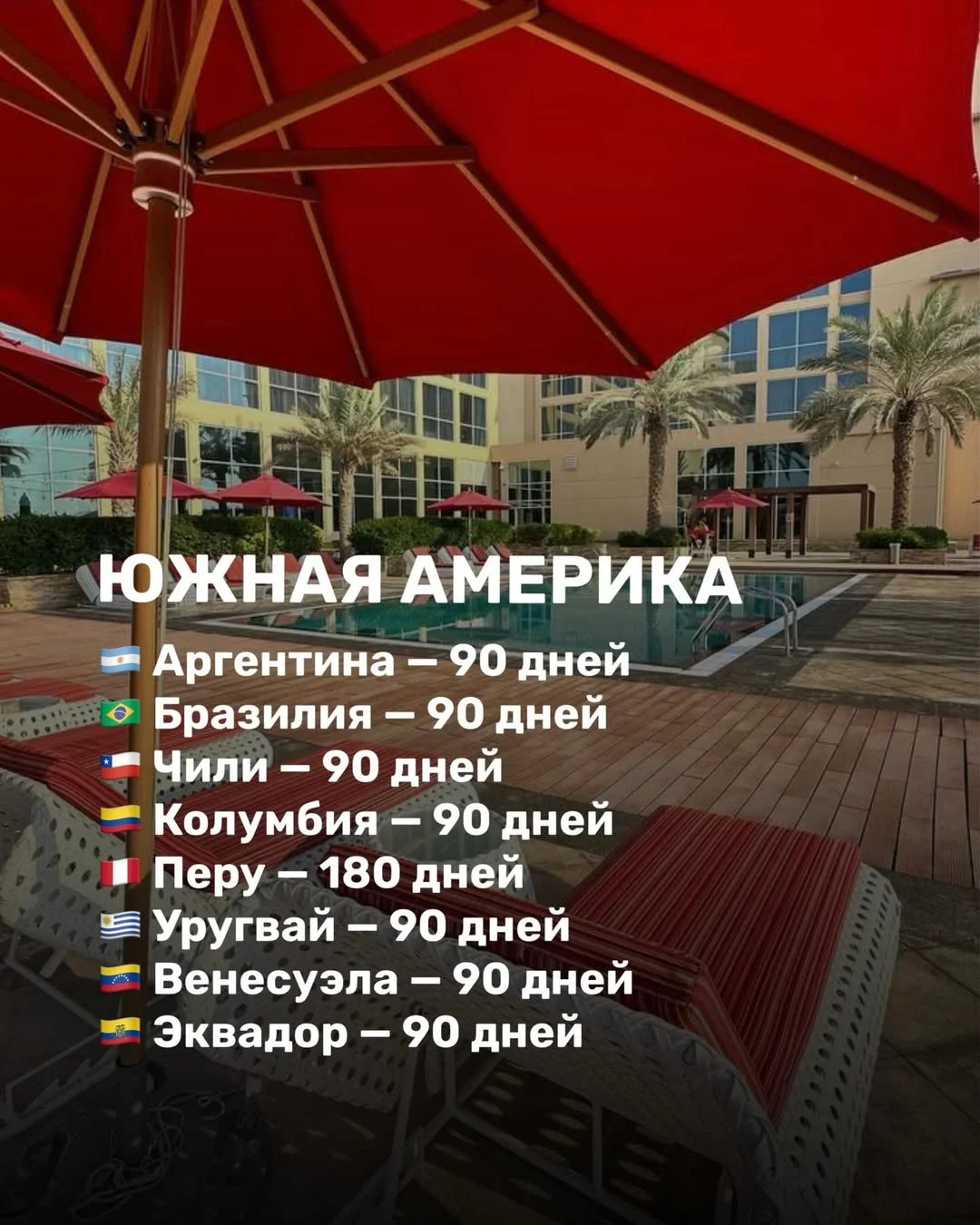 Южная Америка предлагает одни из самых длительных сроков пребывания. Аргентина, Бразилия, Чили, Колумбия, Уругвай, Венесуэла и Эквадор разрешают находиться до 90 дней, а Перу — до 180 дней без визы.