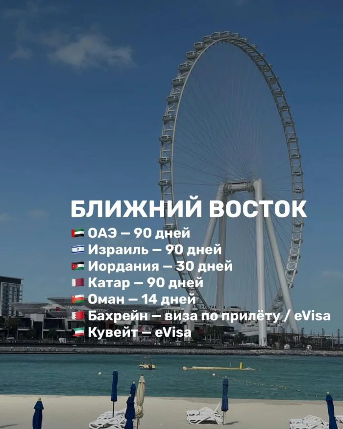 Ближний Восток предлагает комфортные условия для длительного отдыха. ОАЭ, Израиль и Катар позволяют находиться до 90 дней, Иордания — до 30 дней, Оман — до 14 дней. В Бахрейне доступна виза по прилёту или e-Visa, а Кувейт предоставляет электронную визу.