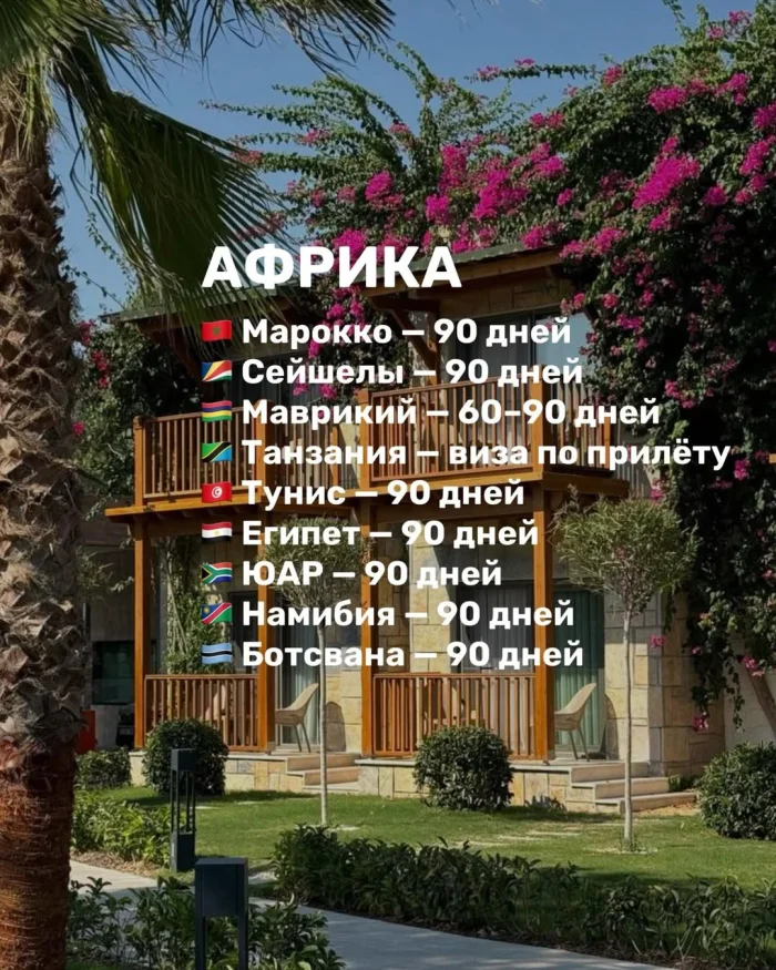 Африка постепенно становится всё более доступной. Марокко, Сейшелы, Тунис, Египет, ЮАР, Намибия и Ботсвана разрешают пребывание до 90 дней. Маврикий предлагает от 60 до 90 дней, а Танзания оформляет визу по прилёту.