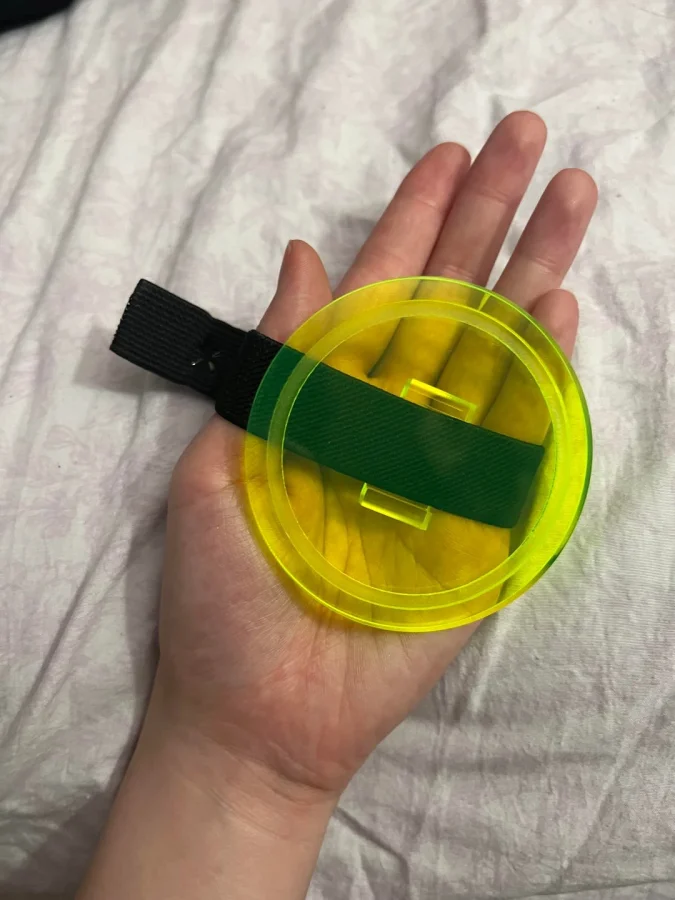 2. Пластиковая пластина с небольшим углублением размером с ладонь, сзади есть регулируемый чёрный ремешок