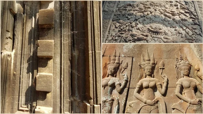 Мастерство обработки камня вызывает восхищение. Швы между блоками настолько тонкие, что между ними невозможно просунуть даже лезвие. Каждый каменный блок массой 1500 килограммов транспортировали по реке на специальных плотах из гор Пном Кулен — преодолевая расстояние в 50 километров вниз по течению. Затем блоки поднимали наверх с помощью земляных пандусов, используя силу слонов и труд 300 тысяч рабочих.