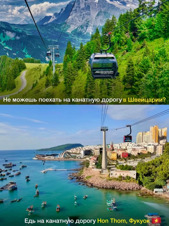 Фукуок может удивить и здесь. Канатная дорога Hon Thom — одна из самых длинных над морем в мире. Во время поездки открываются захватывающие виды на острова, море и джунгли, которые легко соперничают с альпийскими пейзажами.