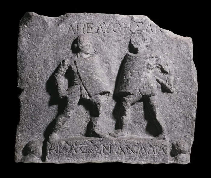 Наиболее известное материальное свидетельство — это так называемый рельеф из Галикарнаса (Британский музей), на котором изображены две сражающиеся женщины с именами «Амазонка» и «Ахиллия»