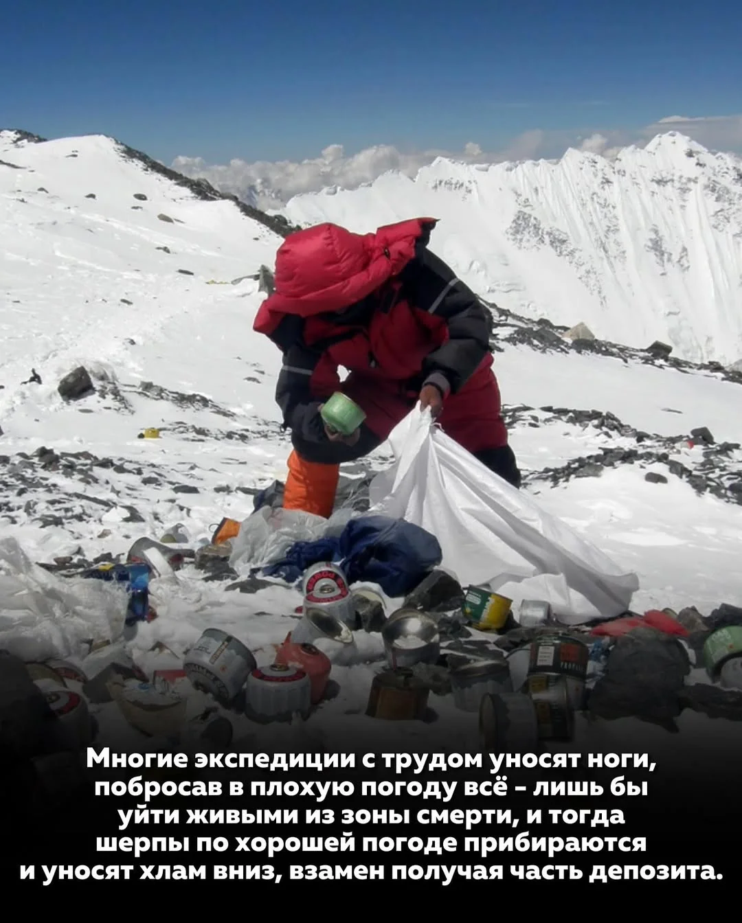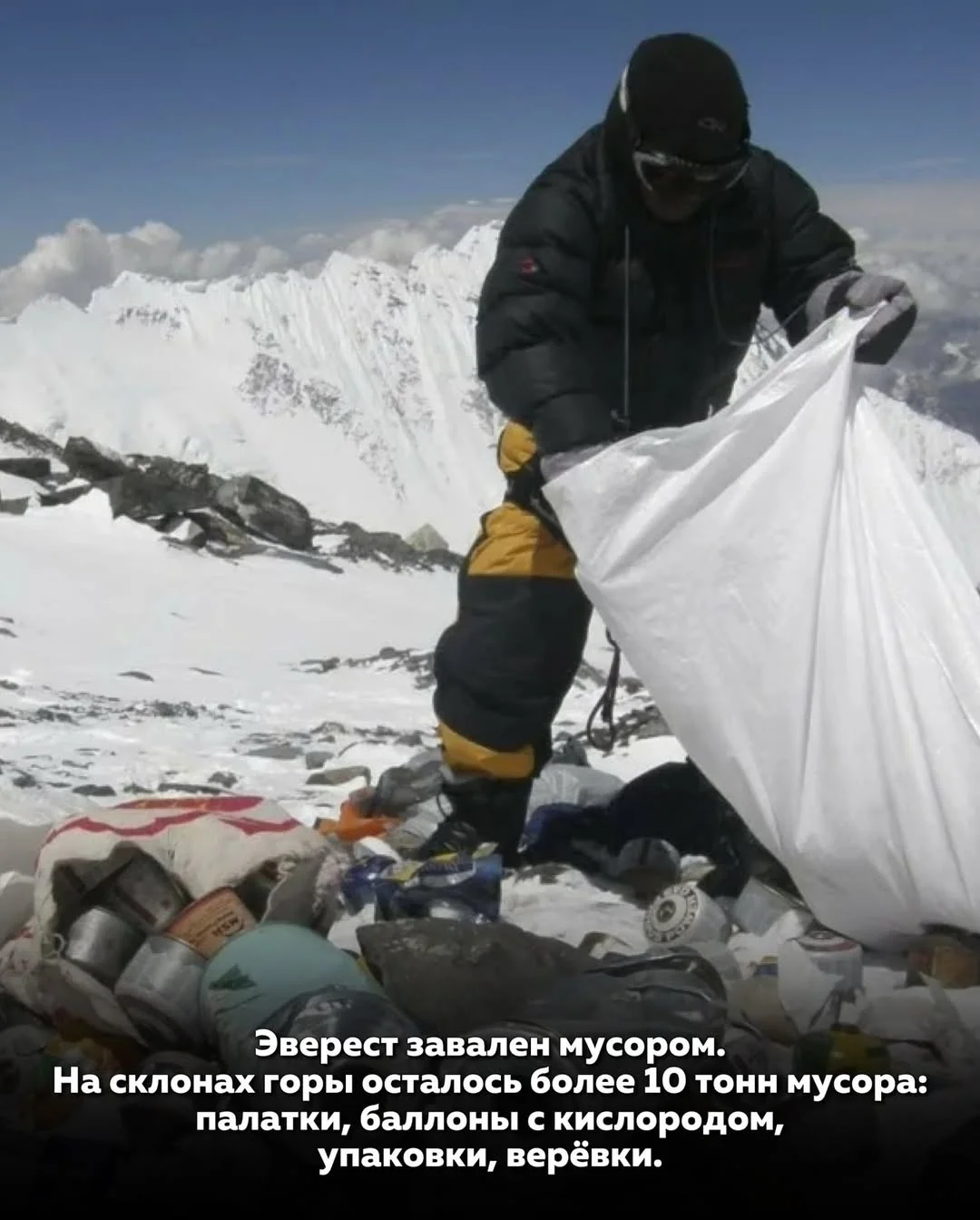 В последние десятилетия Эверест столкнулся с ещё одной серьёзной проблемой — мусором. По разным оценкам, на склонах горы и в высокогорных лагерях скопилось более 10 тонн отходов. Это остатки палаток, кислородные баллоны, упаковка от еды, верёвки и элементы снаряжения. В экстремальных условиях альпинисты часто вынуждены бросать всё лишнее, чтобы просто спасти себе жизнь, особенно при резком ухудшении погоды.