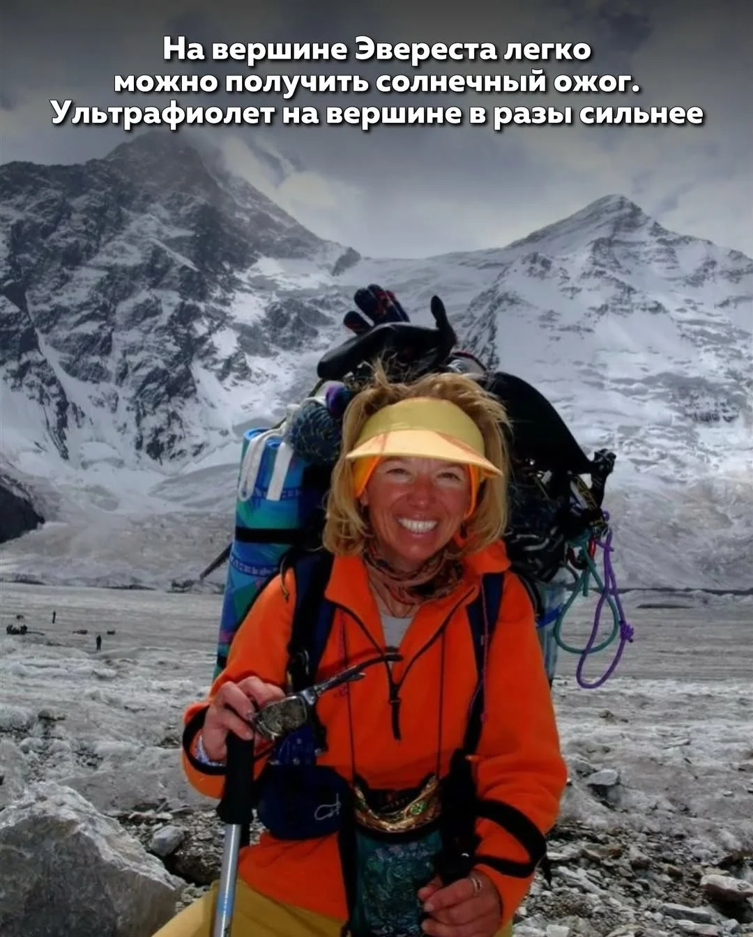 На вершине Эвереста очень легко получить солнечный ожог. Звучит парадоксально, но на высоте более 8000 метров ультрафиолетовое излучение в разы сильнее, чем у подножия гор. Атмосфера здесь значительно тоньше и хуже фильтрует солнечные лучи, а снег и лёд дополнительно отражают свет, усиливая воздействие на кожу и глаза. Именно поэтому альпинисты часто получают сильные ожоги лица и даже временную слепоту, если пренебрегают защитой.