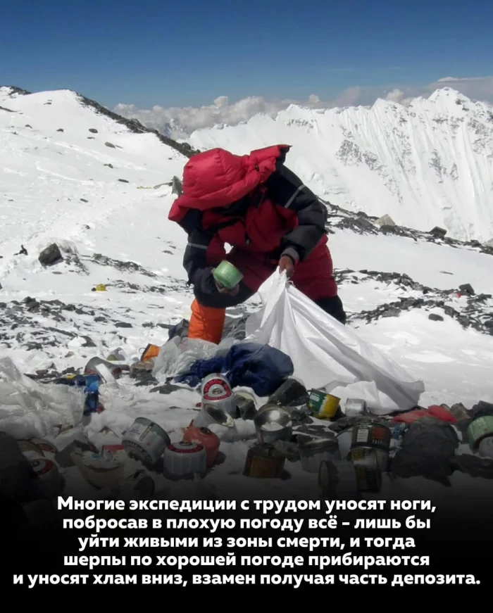 С 2016 года правительство Непала ввело залог для всех экспедиций — около 4000 долларов с группы. Эти деньги возвращаются только в том случае, если альпинисты спускают с горы весь мусор, который подняли с собой. На практике значительную часть уборки выполняют шерпы. В хорошую погоду они поднимаются в зону смерти и выносят вниз чужие отходы, получая за это часть депозита и дополнительное вознаграждение.