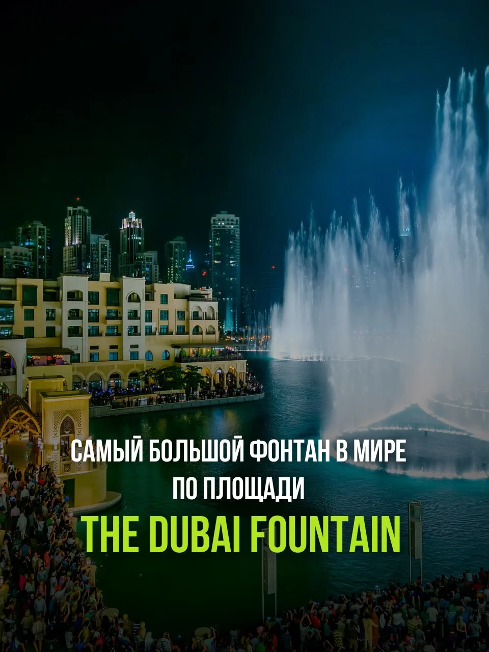 Прямо у подножия Burj Khalifa находится The Dubai Fountain — самый большой фонтан в мире по занимаемой площади. Струи воды поднимаются на высоту до 150 метров, а каждое шоу сопровождается музыкой и сложной световой хореографией. Ежедневно тысячи людей собираются, чтобы увидеть это зрелище, которое стало одной из визитных карточек города.