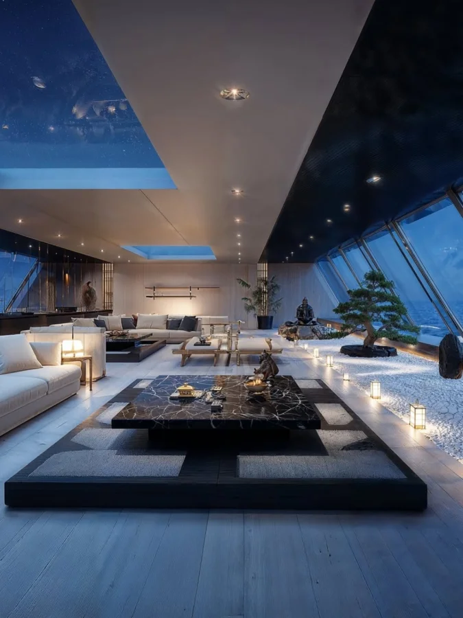 Гостиная в японском стиле погружает в мир дзена и гармонии. Минимализм, натуральные материалы, продуманная геометрия пространства и настоящий сад камней создают ощущение спокойствия и уравновешенности даже посреди океана. Здесь легко забыть о времени и шуме внешнего мира.