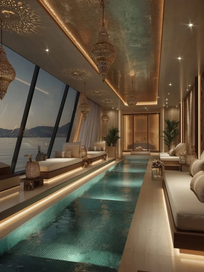 Зона отдыха и восстановления выполнена в марокканском стиле. Хаммам и спа-пространства украшены сложными мозаиками, резными узорами и мягким рассеянным светом фонарей. Здесь роскошь ощущается не в блеске, а в атмосфере уюта, тепла и полного расслабления.