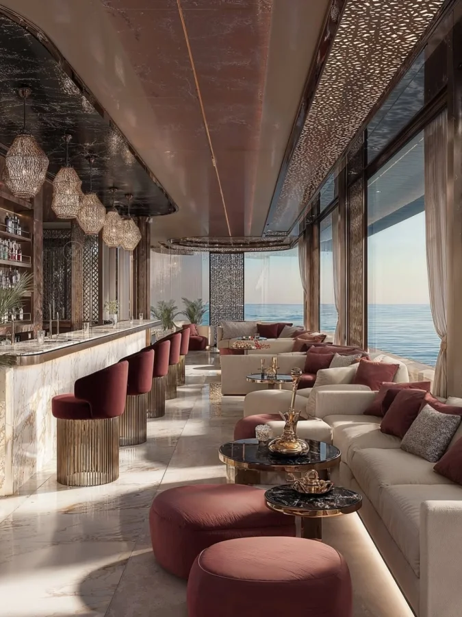 Бар и лаунж в ближневосточной стилистике обволакивают сложными узорами машрабии, арабесками и тёплым золотистым освещением. Это идеальное место для вечернего отдыха с видом на бесконечный горизонт и неспешных разговоров под тихую музыку.