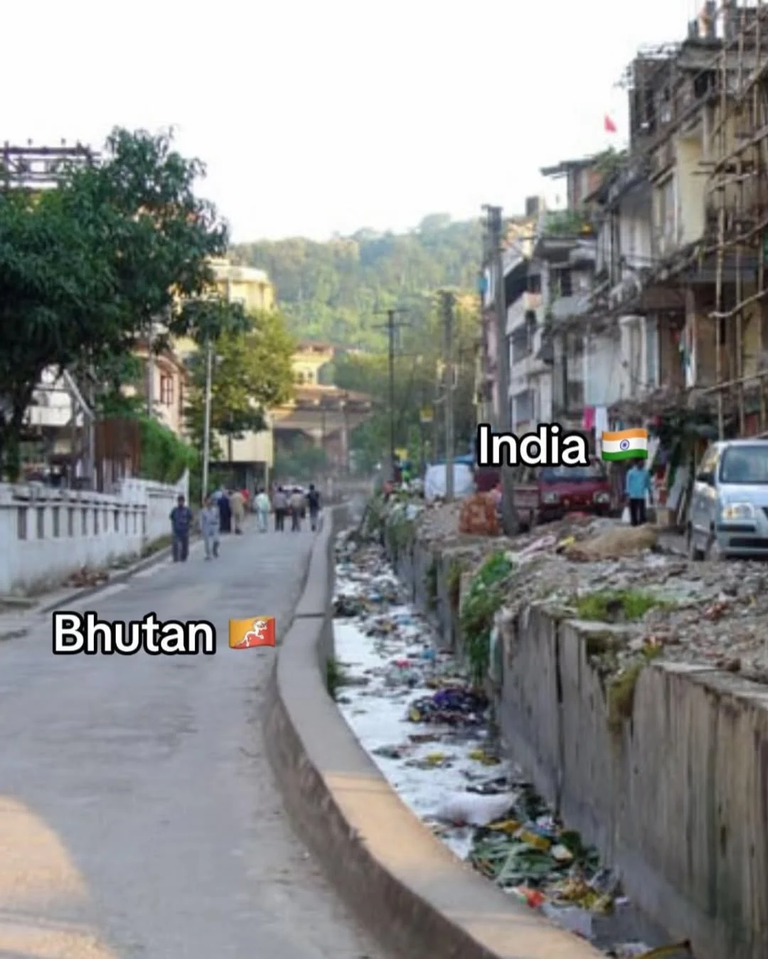 На границе Бутана и Индии разница заметна даже без знаков и шлагбаумов. С одной стороны — ухоженная дорога и порядок, с другой — плотная застройка и бытовой хаос. Бутан уже много лет придерживается политики сохранения экологии и традиционного уклада жизни, в то время как Индия сталкивается с перенаселением и быстрым ростом городов.