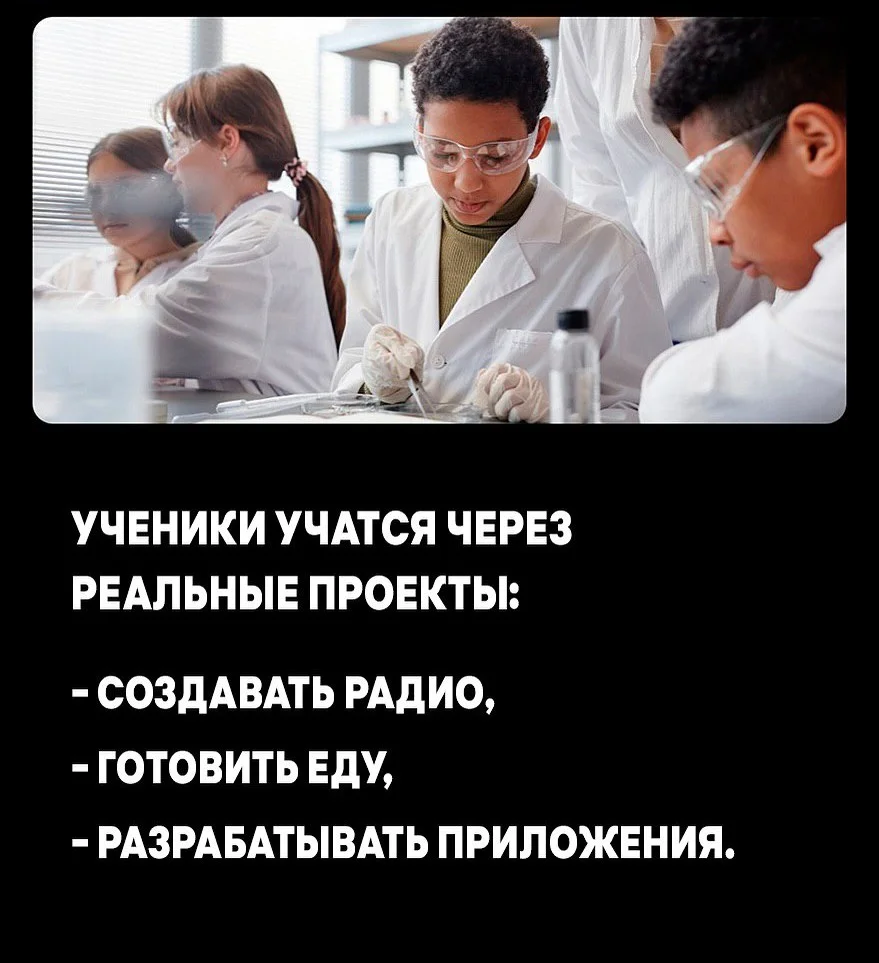 Одним из ключевых принципов является обучение через реальные проекты. Ученики не просто читают учебники, а создают собственные радиостанции, готовят еду, разрабатывают приложения, проводят исследования и работают в командах. Знания здесь сразу находят практическое применение, а учеба становится осмысленной и живой.