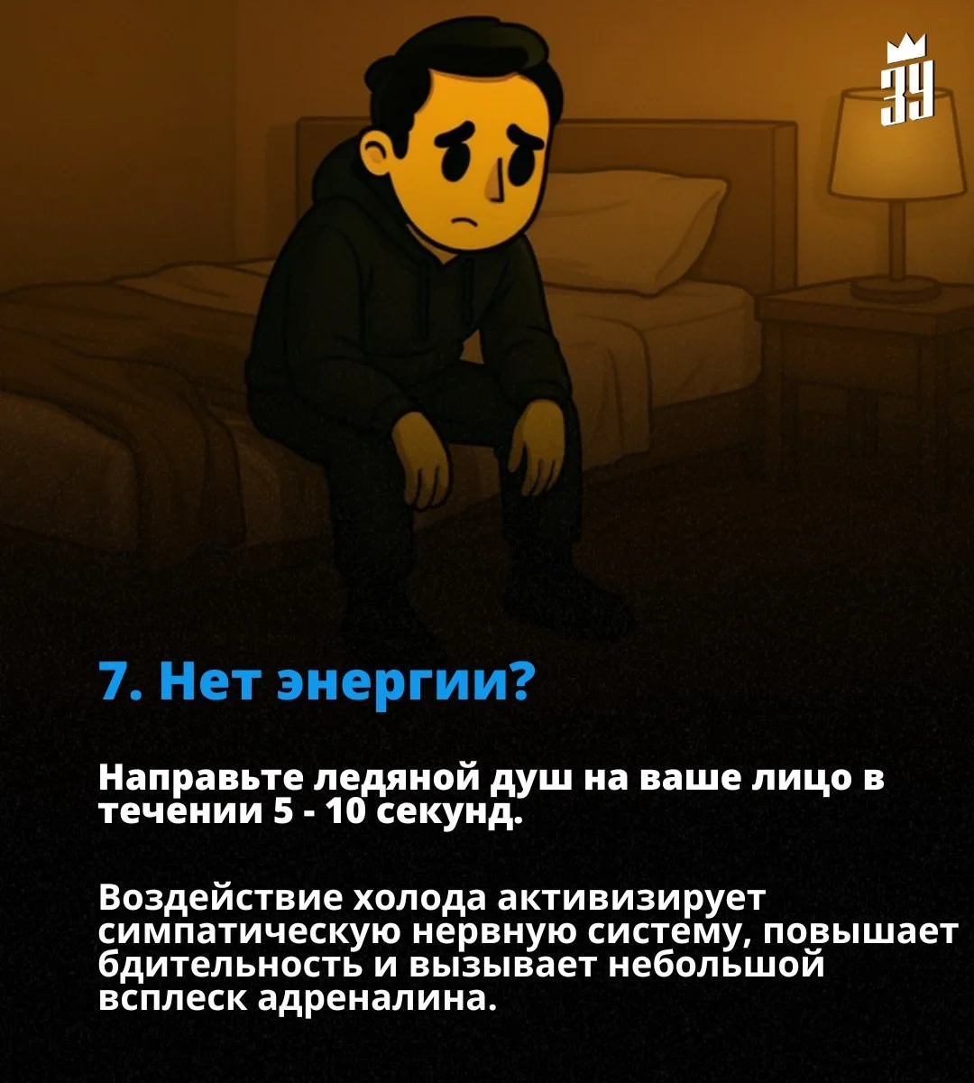 Направьте ледяной душ на лицо на 5–10 секунд. Холод активирует симпатическую нервную систему, повышает бдительность и вызывает небольшой выброс адреналина. Такой приём помогает быстро взбодриться без кофеина.