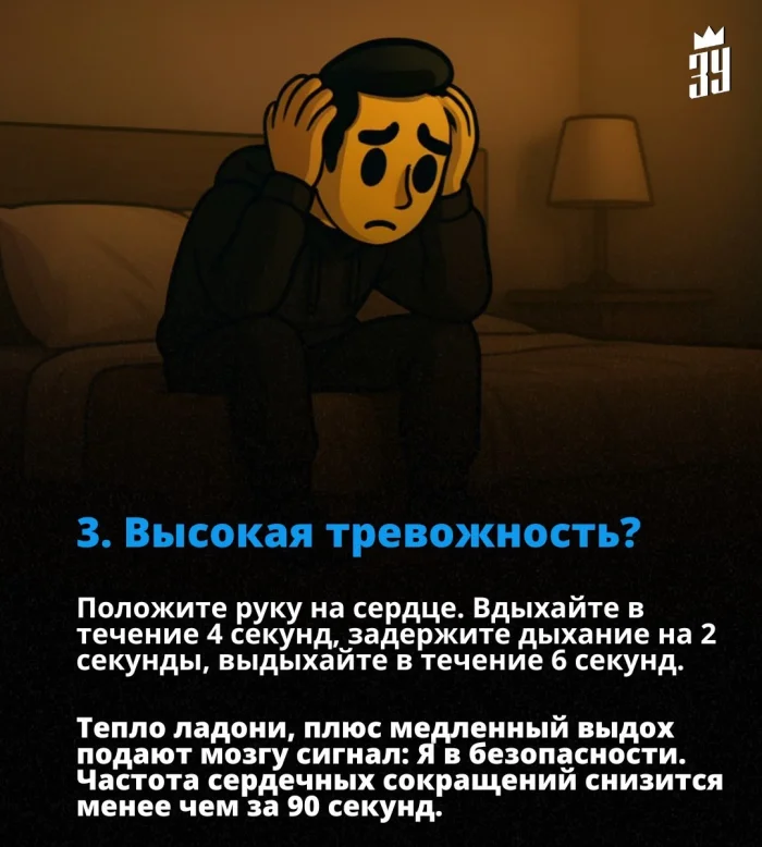 Положите ладонь на область сердца. Вдыхайте 4 секунды, задержите дыхание на 2 секунды и выдыхайте 6 секунд. Тепло ладони и удлинённый выдох посылают мозгу сигнал безопасности. Уже через 1–2 минуты частота сердечных сокращений заметно снижается.