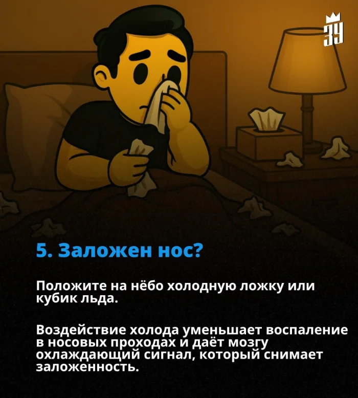 Приложите к нёбу холодную ложку или кубик льда. Холод снижает воспаление в носовых проходах и даёт мозгу охлаждающий сигнал, который способствует уменьшению заложенности и облегчению дыхания.