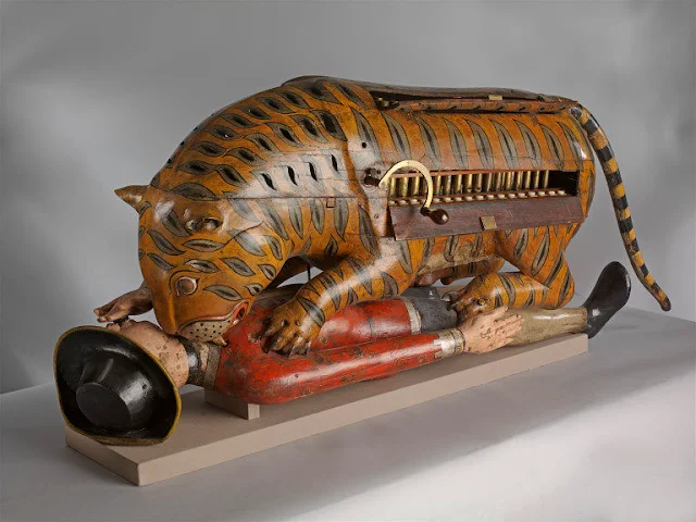 Победители бросились грабить казну, а спустя несколько недель среди ценных сокровищ, хранящихся в дворцовой музыкальной комнате, обнаружили необычный артефакт — крупный деревянный автомат, изображавший тигра, разрывающего человека в европейском костюме.