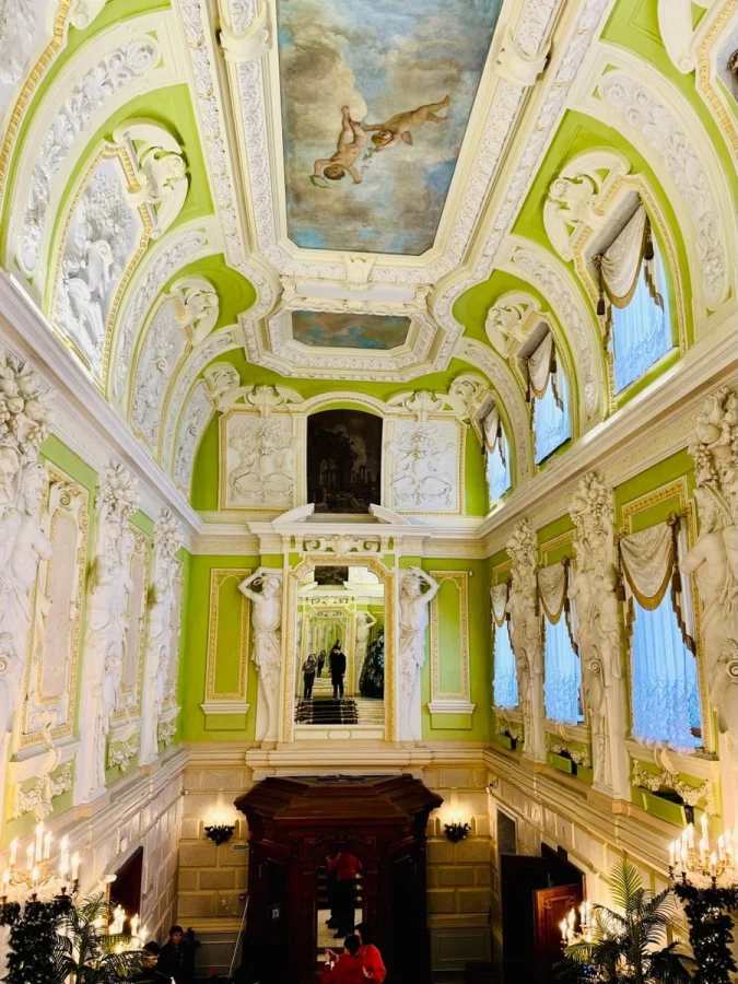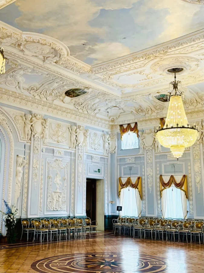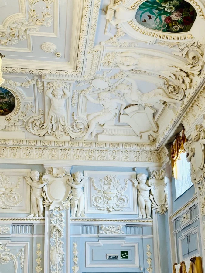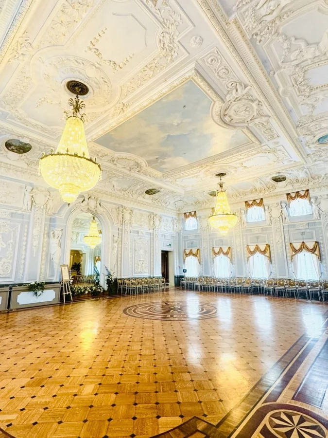 Финал маршрута — Большой танцевальный зал. Пространство для балов и приёмов, где идеально всё: лепной потолок, зеркала, паркет, люстры. Сегодня здесь проходят концерты и культурные события — и кажется, что этот зал по-прежнему живёт своей светской жизнью.
