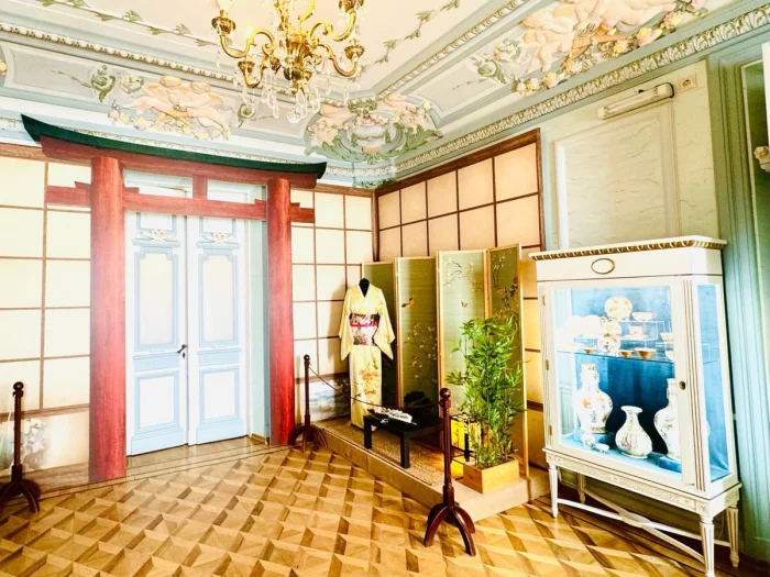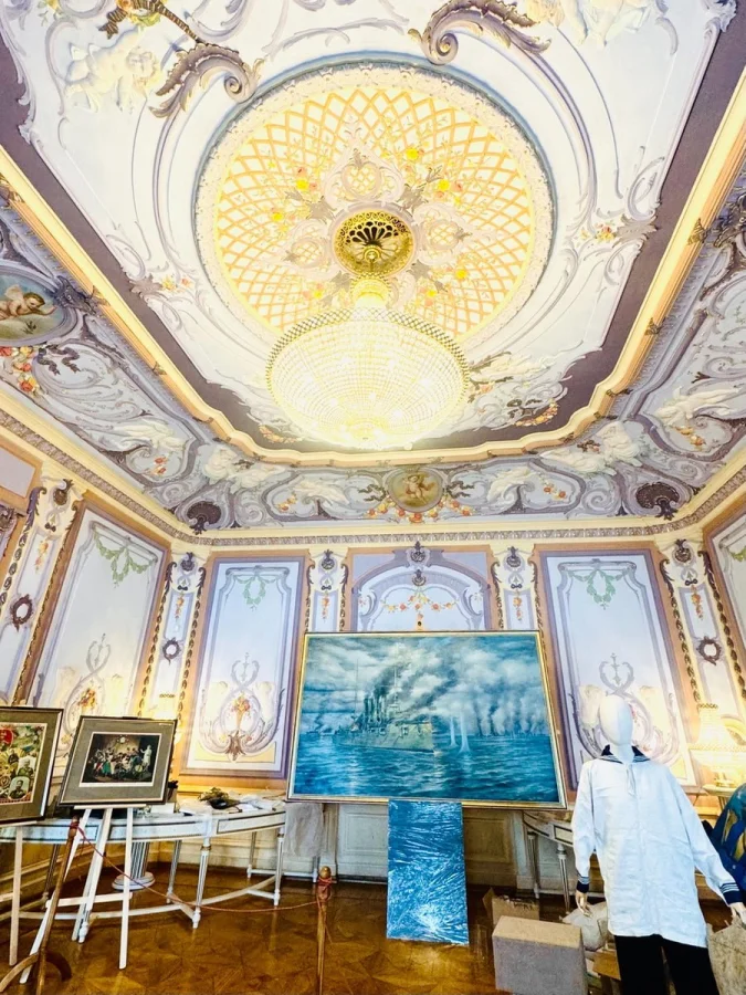 Гостиные, напротив, светлые и нарядные. Голубая — для камерных встреч. Сиреневая парадная — с ангелочками, лепниной и роскошной люстрой. Сегодня в этих залах размещаются экспозиции, в том числе посвящённые крейсеру «Варяг» и событиям русско-японской войны.